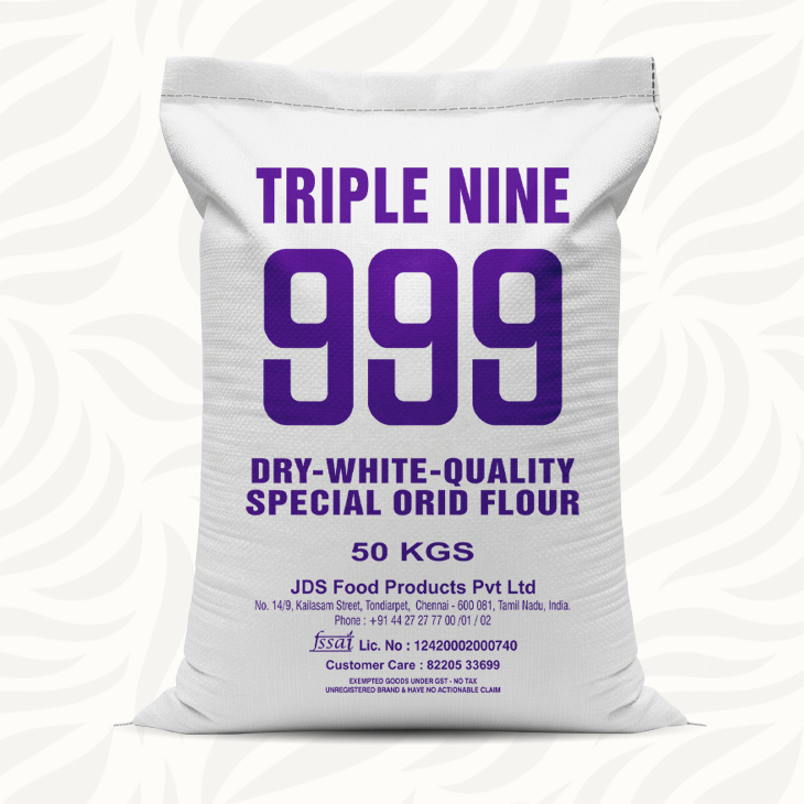 JDS 999 Orid Dry White Quality Flour is a premium industrial-grade lentil flour specifically engineered for the high-volume manufacturing of Appalams (papadums). Within the industry, the “999” mark is a hallmark of superior refinement, ensuring the flour meets the rigorous structural demands of traditional dough stretching and sun-drying.