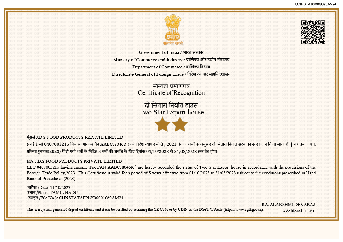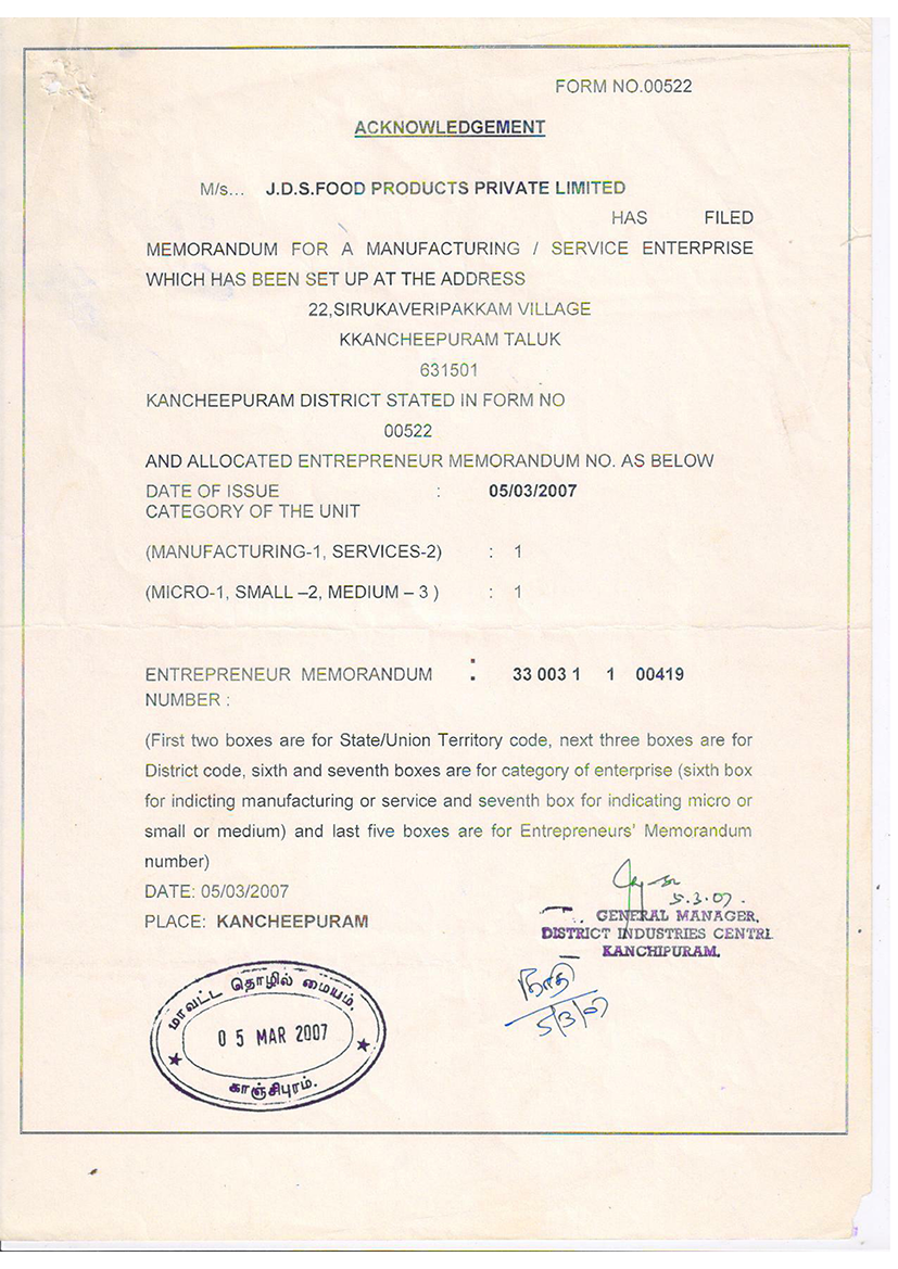 JDS FOOD PRODUCTS PVT LTD – Founded in 2007 by technocrat mechanical engineer, J.Devdas, along with his wife Bhuvaneswari Devdas. JDS Food Products Pvt Ltd is a Chennai-based food products manufacturer focused on traditional Indian food products,