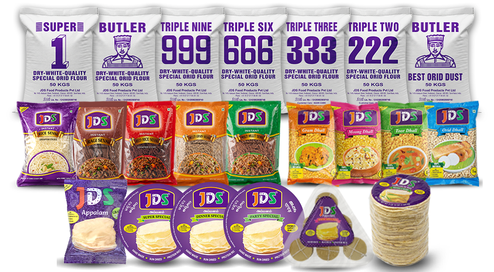 Experience time-honored flavors inspired by South Indian culinary traditions with JDS Brands, our premium range of Appalam also known as Pappadum / Poppadum / Pappad / Pappad etc. Pulses Variants also known as Dhall/ Lentils, Sevai Varieties such as Rice, Ragi, Grains, Millets & Mult millets, and Special Orid Dhall flour Varieties (Dry -White – Quality) Orid Flour also known as Urid Flour / Urad Flour / Black Gram Flour, delivered fresh and reliably to your doorstep.